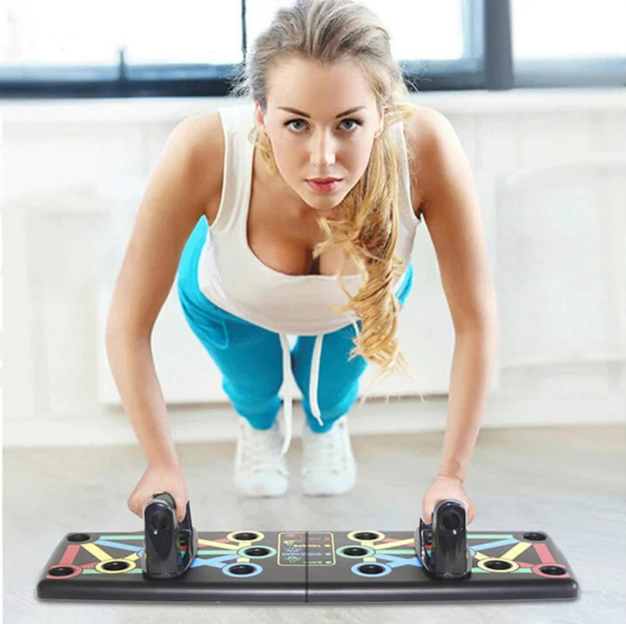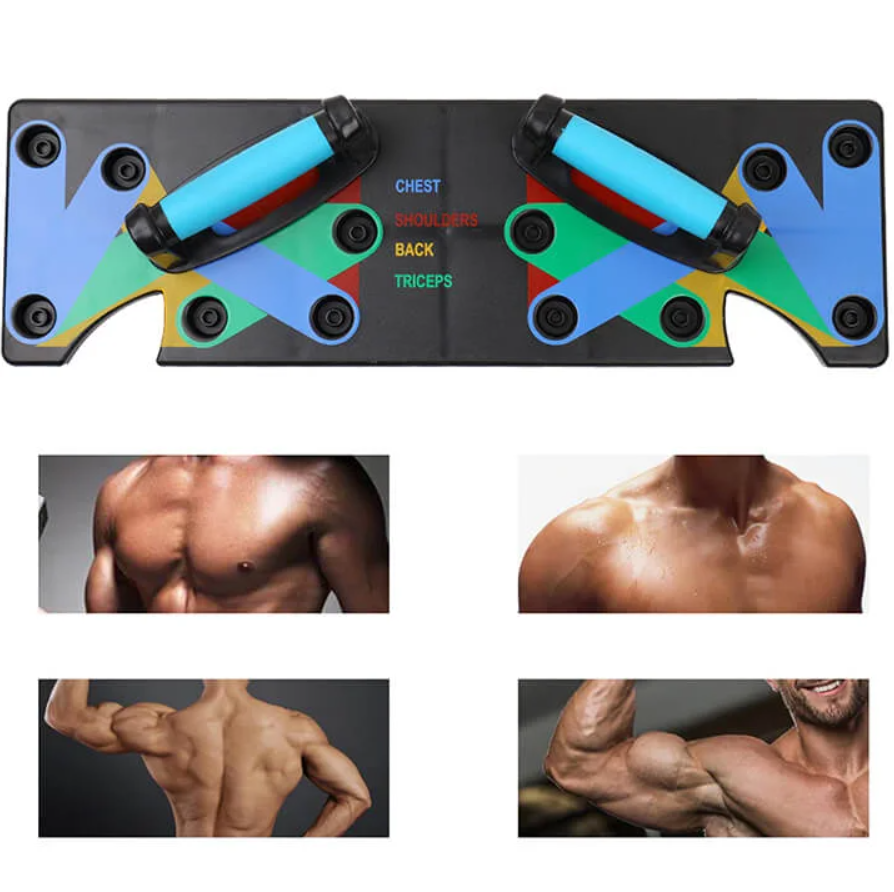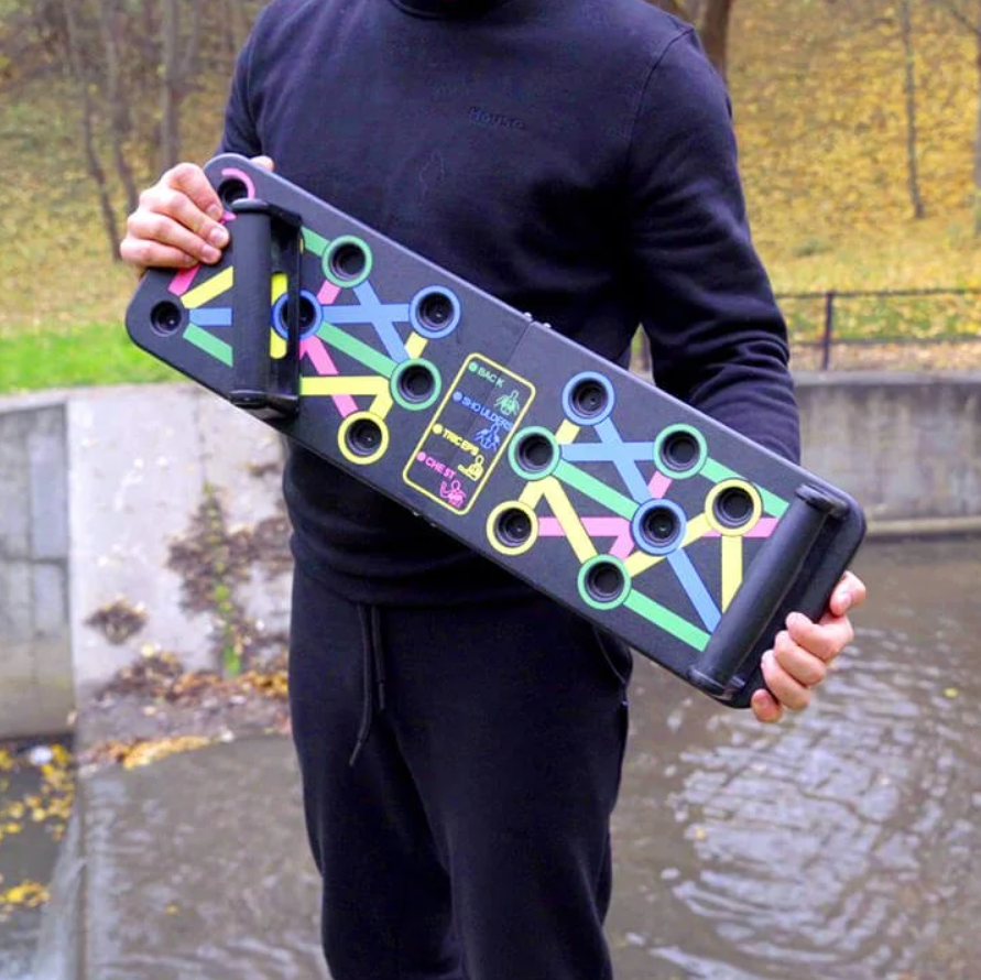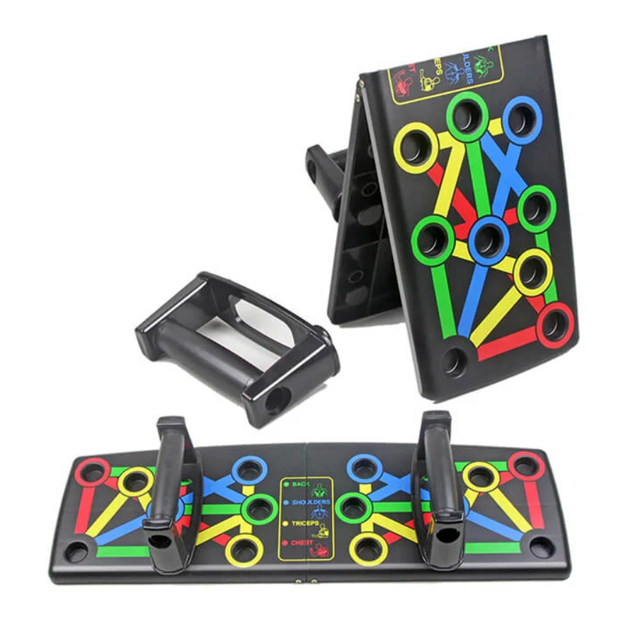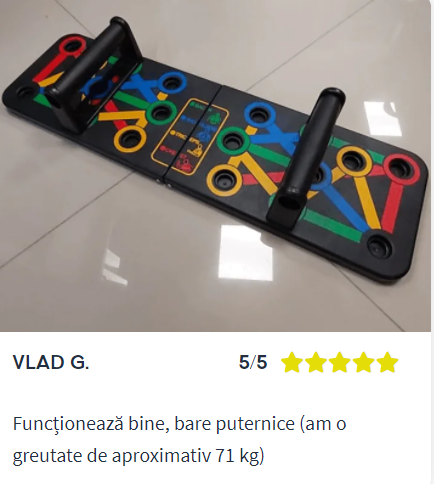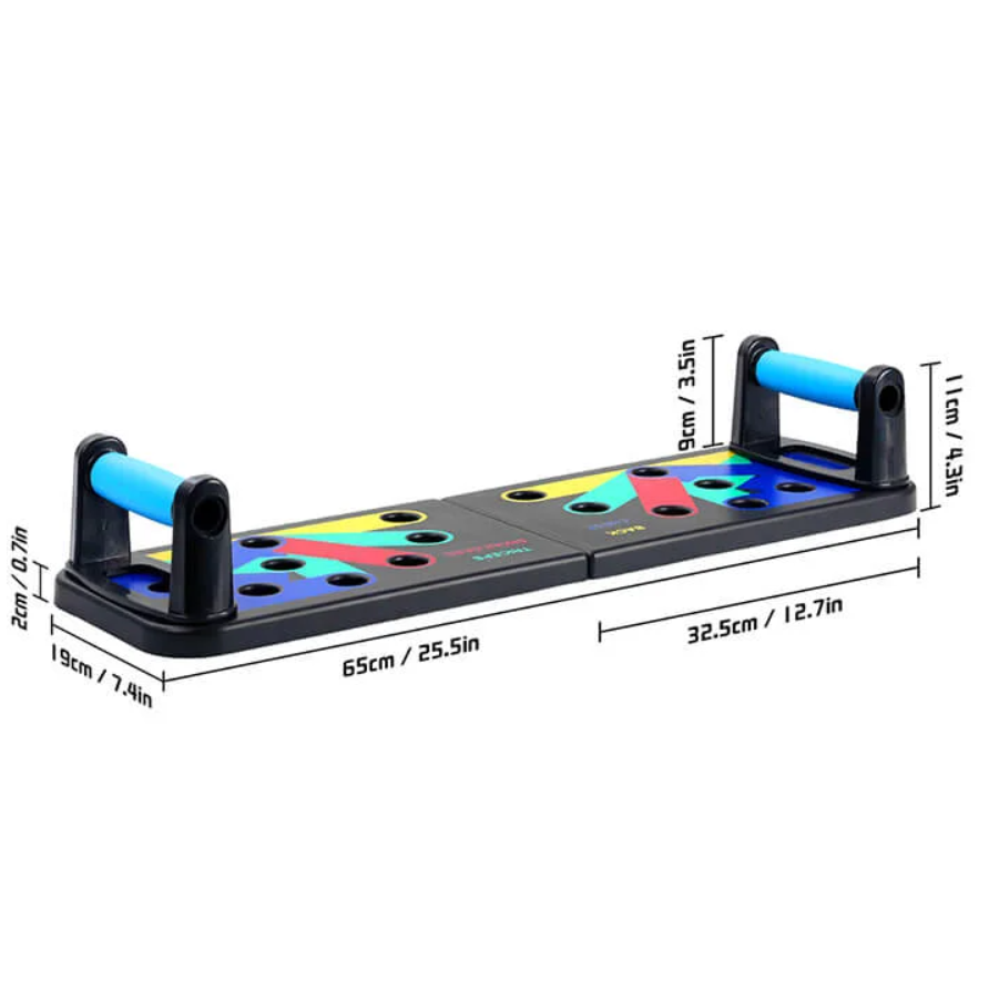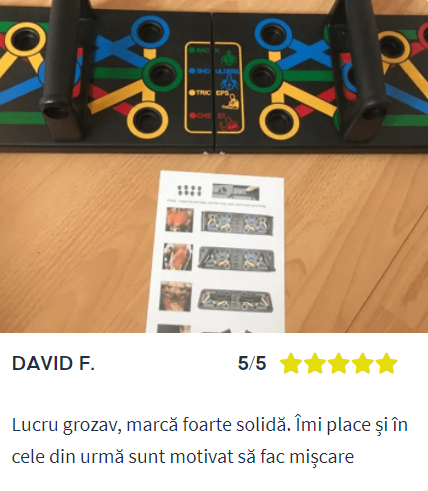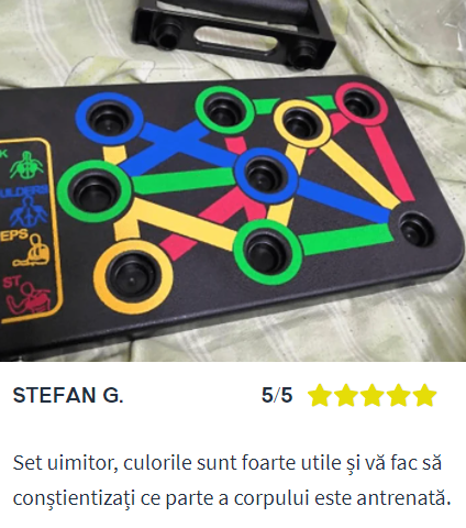 Poziția incorectă a brațului și a încheieturii mâinii în timp ce faceți apăsări face antrenamentul mai puțin eficient. Cu ajutorul sistemului de culori de pe tablă, veți fi siguri că poziția și exercițiile fizice sunt corecte. În plus, barele acoperite cu cauciuc vă ofera aderență mai puternică și îmbunătățesc poziția corectă a încheieturii mâinii.