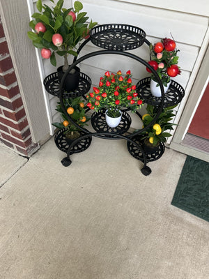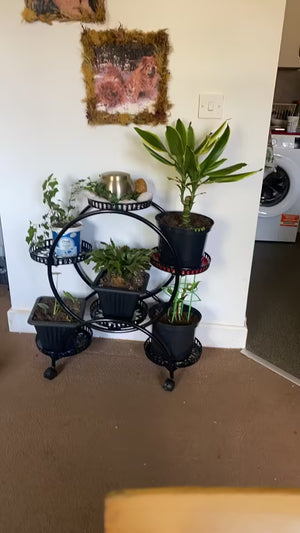 Inspirat din forma unei roți tradiționale de apă, acest suport metalic pentru flori adaugă un farmec aparte spațiului tău. Cu 6 platforme pentru ghivece, dispuse pe mai multe niveluri, este ideal pentru a crea un decor armonios în balcon, terasă sau living.