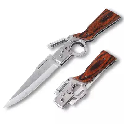 Fie că deschizi cutii, tai sfoară sau cureți pește, acest cuțit pliabil cu lamă din oțel inoxidabil, mâner ergonomic din lemn și lanternă LED integrată e mic, practic și mereu la îndemână – exact ce-ți lipsea din trusa de unelte!